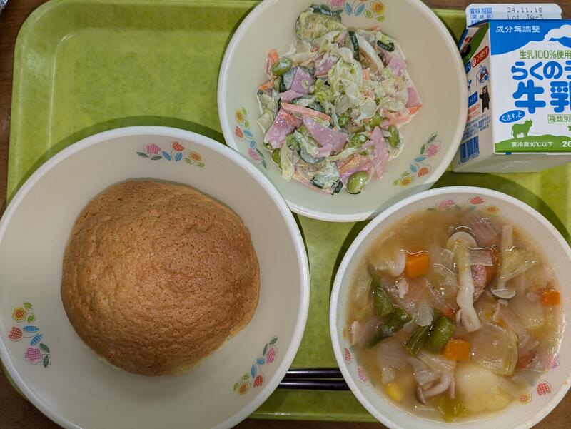 今日の献立は、栗のクリームパン、コーンポタージュ、ハムサラダでした。秋の訪れを感じる栗メニュー。子どもたちの中には「栗の実が苦手です。。。」と話しているお友だちもいましたが、今日のクリームは栗のペーストを使ってなめらかな仕上がりになっていました。1年生の子どもたちもおかわりの希望者がたくさんいました。
