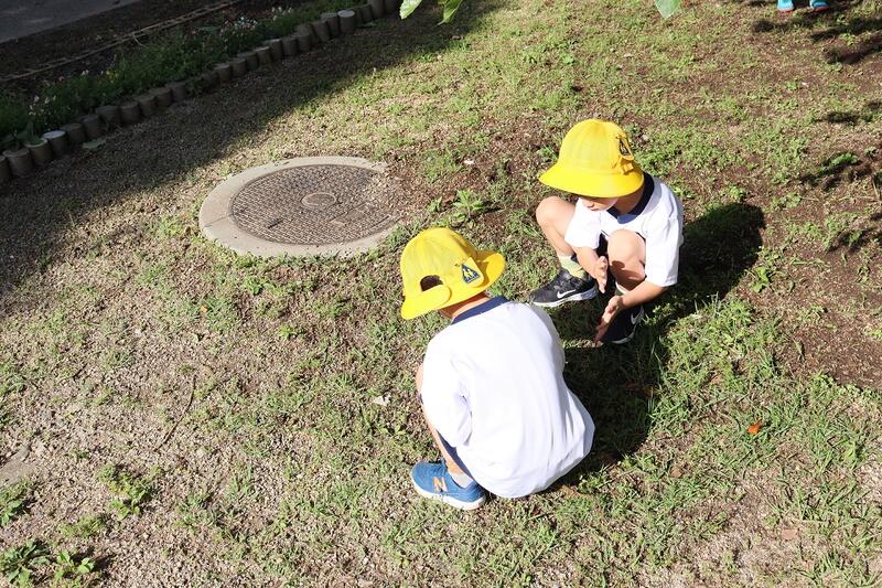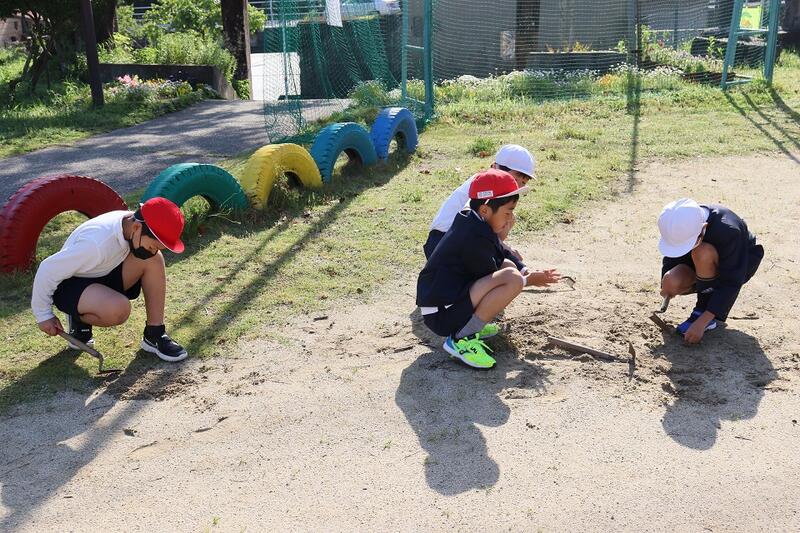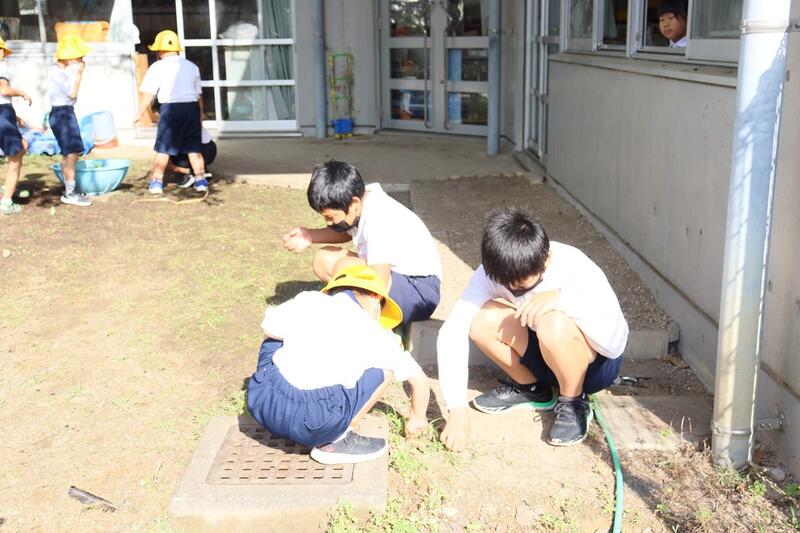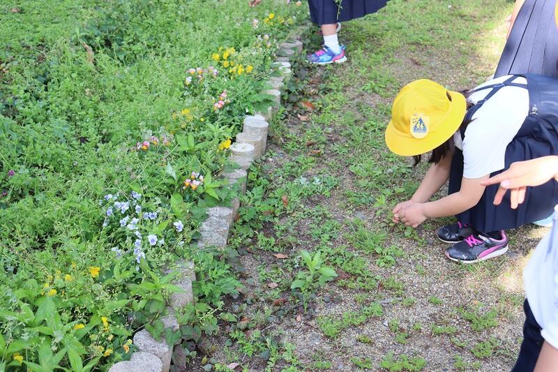 5時間目、1年生が生活科の学習で学校の周りの探検をしました。