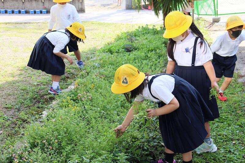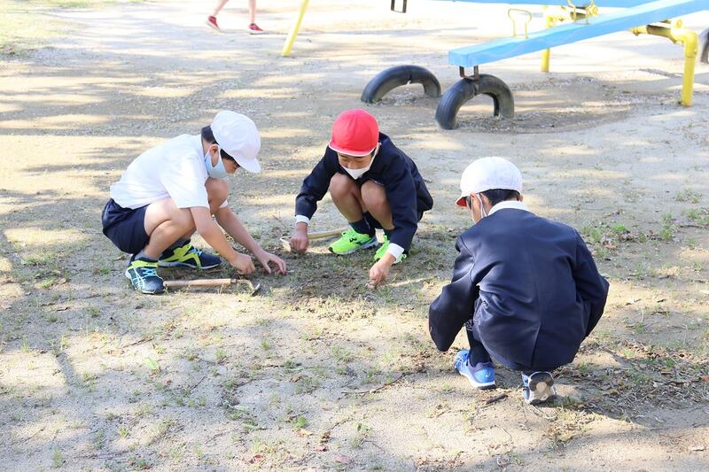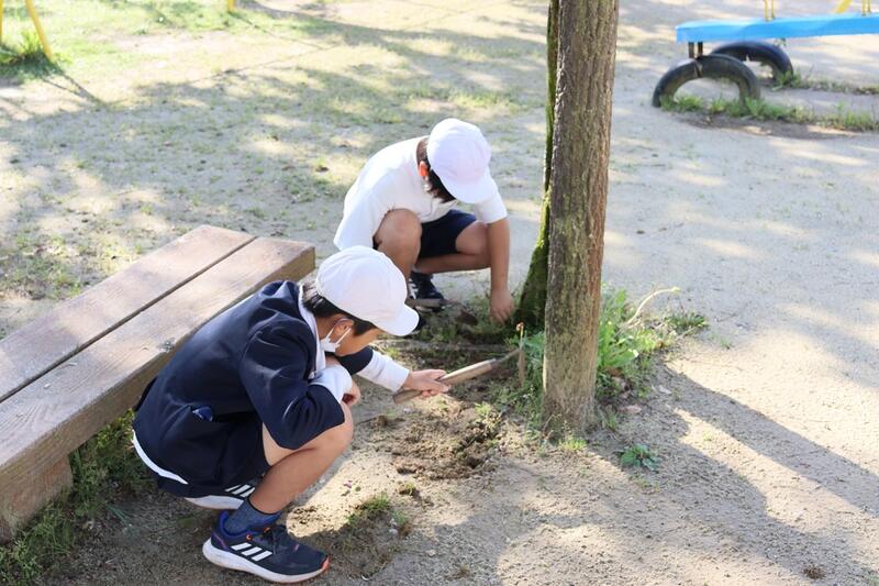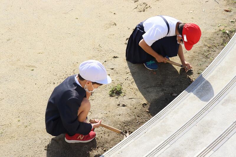 今朝も、運動場や低学年棟周りの草取りを頑張ってくれていた子どもたちを紹介します。