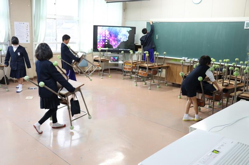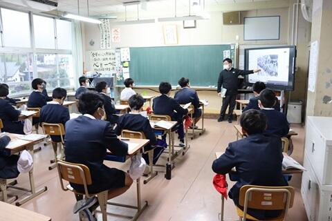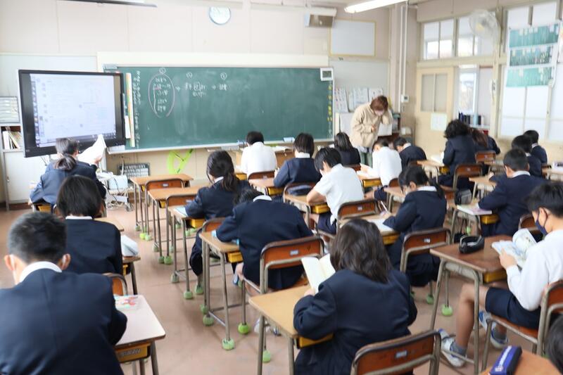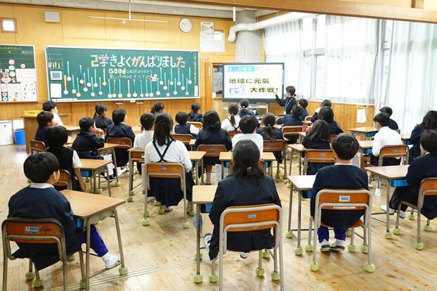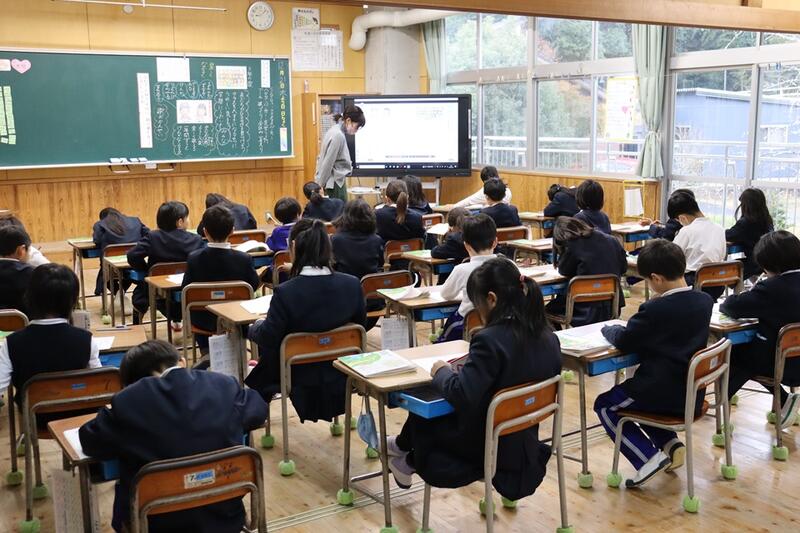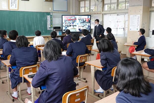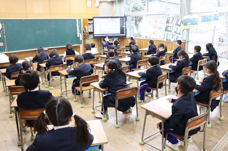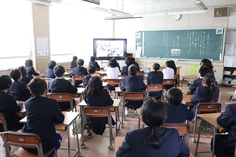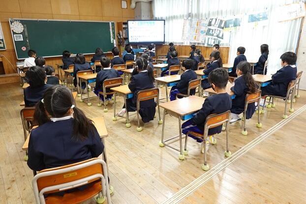 子どもたちは、各教室で電子黒板をしっかりと見つめながら集中して聞くことができていました。