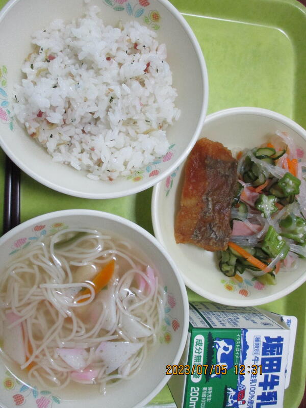 今日の献立は、梅ちりめんご飯、魚のバーベキューソース、オクラの酢の物、そうめん汁でした。今日の魚はホキでした。バーベキューソースは給食室の手作りです。りんごピューレ(すりおろし)に、濃口、砂糖、レモン、酒、水を加えて煮込み甘酸っぱいソースになりました。