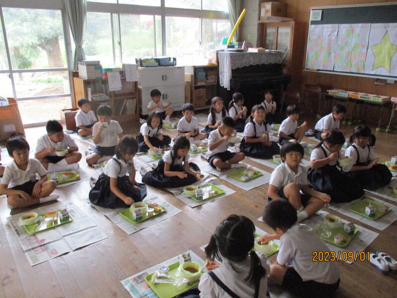 今日9月1日は防災の日。給食では避難所生活を想定したメニューを実施しました。献立はミルクパン、パッククッキングカレー、バナナ、ヨーグルトでした。パッククッキングカレーは、ビニール袋にカレーの材料(野菜、ウインナー、カレールー、水)を入れ、空気を抜いて口をしっかり結んで、10分間熱湯でゆでたら完成です。一人分ずつ個別になっているので、衛生的で配るのも簡単です。避難所生活で水が不足することを想定し、お椀は汚さないようにビニールの受け皿として使いました。教室では、床に新聞を敷いて、電気を消して、「停電したらどうなるか。」など想像しながら食べました。パッククッキングカレーは、子どもたちに「おいしい。」と好評でした。ご家庭でも、災害時の備えについて話し合ってみられてはいかがでしょうか。