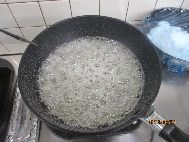 21日の初登場デザート「りんごあめ」の試作をしました。砂糖水をじっくり煮詰めて150℃まで加熱し、りんごにからめ、固まったら4等分して串に刺しました。子どもたちもとても楽しみにしてくれています。当日も成功しますように!