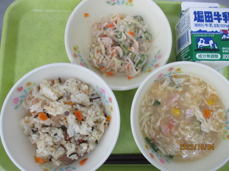 今日の献立は、中華おこわ、もやしとささみのサラダ、たまごスープでした。おこわは、いつものお米(うるち米)ともち米を1:1で混ぜて炊き、もちもちとした食感に仕上がりました。たまごスープは水溶き片栗粉でスープにとろみを付けてから溶き卵を入れると、かき玉が浮いてふわふわのスープになります。今日もみんなよく食べていました。