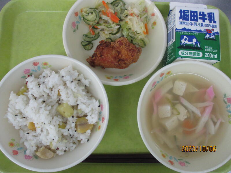 今日の献立は、いも栗ごはん、鶏の唐揚げ、コールスロー、すまし汁でした。今日は年に一度の栗ごはんの日でした。とても高価なため、たくさんの量を使うのは無理なので、さつまいもも混ぜていもと栗のご飯にしました。子どもたちの中には栗が苦手な人もけっこういました。初めて食べます、と教えてくれたお友だちも!秋の味覚をみんなで味わいました。