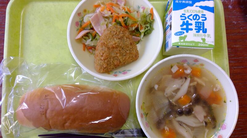 今日の献立は、ミルクパン、かぼちゃフライ、ハムサラダ、ポテトスープでした。かぼちゃフライは昭和の時代からの給食人気メニューです。保護者の皆様も給食で食べられたことがあるのではないでしょうか。