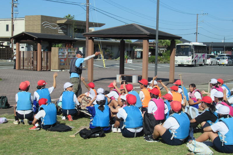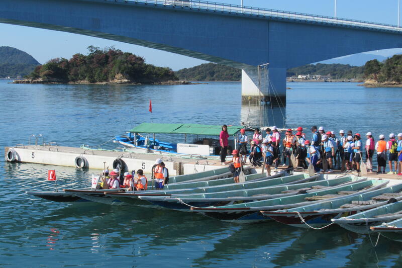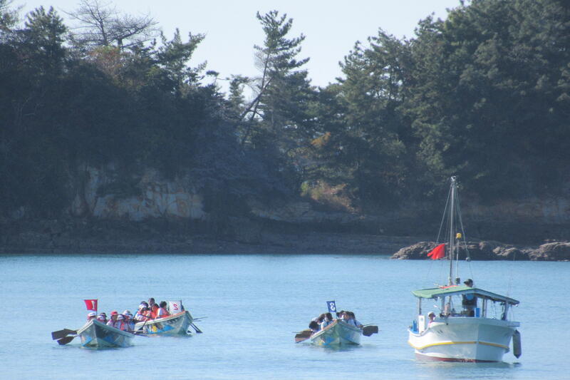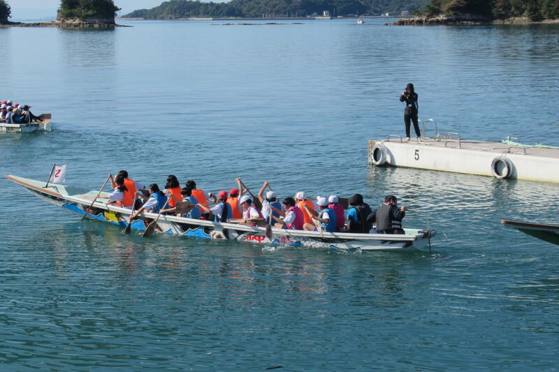 「1、2、3!」の掛け声と櫂の動きを揃えることが大切です。チームワークです。