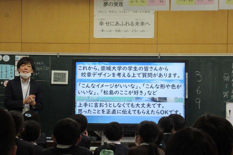 デザインを委託された崇城大学の学生さんたちと統合したときの最上級生である4年生が集まって行いました。阿村小学校、教良木小学校の4年生も一緒です。