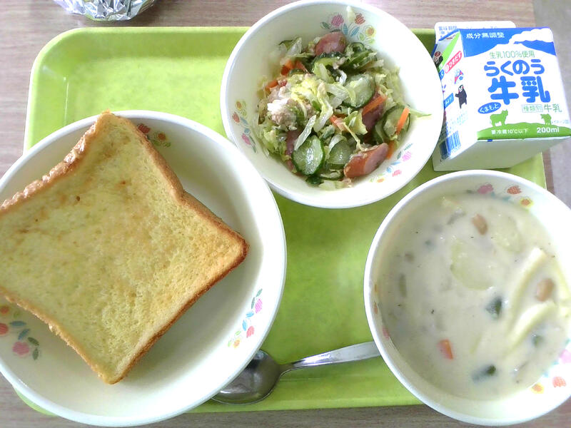 今日の献立は、フレンチトースト、クリーム煮、イタリアンサラダでした。フレンチトーストは、給食室の手作りです。砂糖、バターをすり混ぜ、卵、牛乳を混ぜ、食パンをひたしてオーブンで焼きました。2年生の今津っ子からレシピのリクエストをもらいました。
