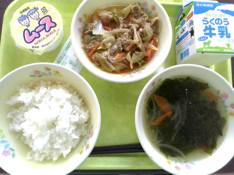 今日の献立は、ごはん、焼肉、ワカメスープ、ムースでした。3年生教室ではほぼ全員が焼肉をおかわりし、ぱくぱくと食べてくれました。なのはな学級では、デザートのムースが大好評でした。