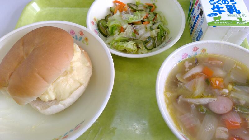 今日の献立は、栗のクリームパン、ポトフ、ちりめんサラダでした。秋メニュー、栗のクリームパンは、いつものカスタードスリームに栗のペーストを加えています。1年生も上手にパンにくりーむをはさんでたべることができました。