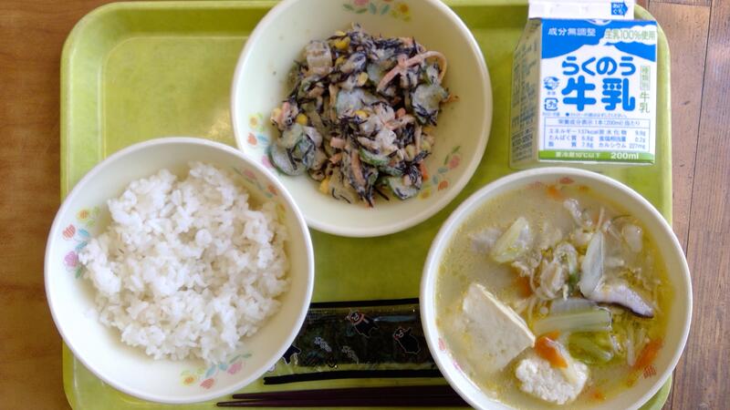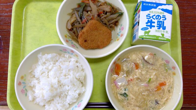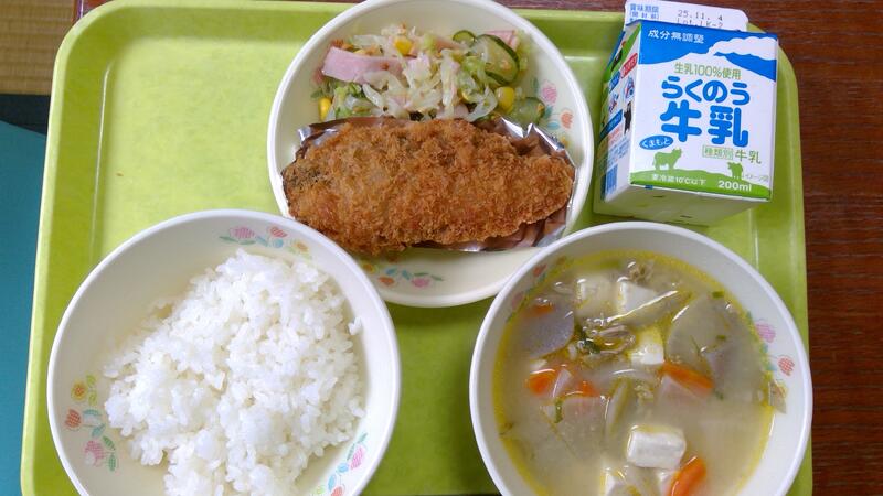 今日の献立は、林田さんのごはん、さけフライ、ピーナッツ和え、豚汁でした。今日は月に一回の地元米の日でした。なのはな学級では「ごはんがピカピカ光っているね。」「新米はおいしいね。」といった声が聞かれました。