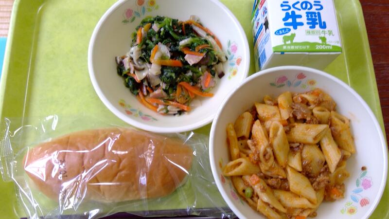 今日の献立は、ミルクパン、ペンネのミートソース、ほうれん草サラダでした。ペンネは「ペン先」という意味で形がその名の通りペン先に似ています。マカロニのように筒状になっているので、穴の中にパスタソースがからむことでおいしくなります。今日のようなミートソースやクリームソースなどがよく合うパスタです。