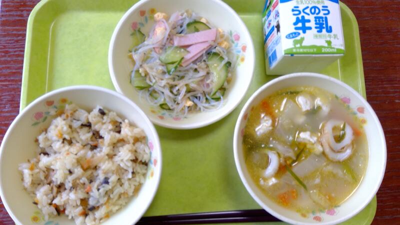 今日の献立は、中華おこわ、バンサンスー、五目スープでした。中華おこわは米ともち米を3:2の割合で混ぜて炊き、ちょうどよいもちもちした食感でした。子どもたちに大人気の副菜バンサンスーは、ハム、炒り卵、きゅうり、もやし、春雨の中華酢の物です。「やったー!」と喜ぶ今津っ子がたくさんいました。
