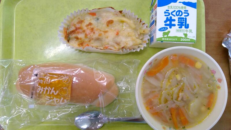 今日の献立は、コッペパン、みかんジャム、グラタン、オニオンスープでした。グラタンのホワイトソースは給食室の手作りです。味付けはコンソメと塩で優しい味に仕上げました。子どもたちも大好きなメニューでパクパクと食べてくれました。