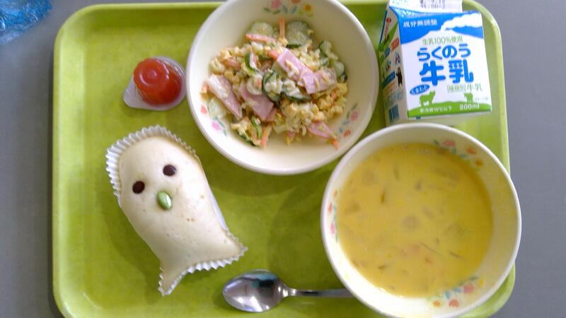 今日の献立はオバケーキ、かぼちゃシチュー、マカロニサラダ、ハロウィンデザートでした。昨年大好評だったハロウィンメニューのオバケーキ、今年も喜んで食べてくれました。白い蒸しパンにチョコを飾るだけなので「家で作ってみます!」とやる気満々の今津っ子もいました。ハロウィンデザートは初登場の熊本県産トマトゼリーでした。ふたが真っ白で何も書いてないので、子どもたちは「何の味かな?」と予想しながら食べてくれていました。八代産のはちべえトマトピューレとジューシー(オレンジジュース)を混ぜて作ってあります。