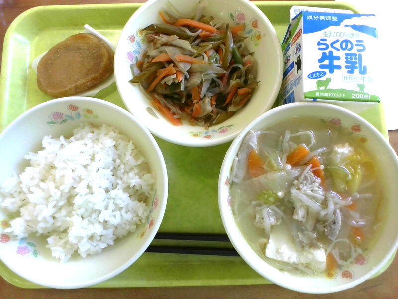 今日の献立は、丸パン、さつまいもポタージュ、ごぼうサラダでした。さつまいもポタージュには、生のさつまいもと、さつまいものペーストがたっぷり入って甘みのあるスープに仕上がりました。スープに浮かべるクルトンは手作りです。食パンを小さなサイコロに切って高温のオーブンで10分間カリカリに焼きました。6年生ではスープの増量に長蛇の列ができていました。