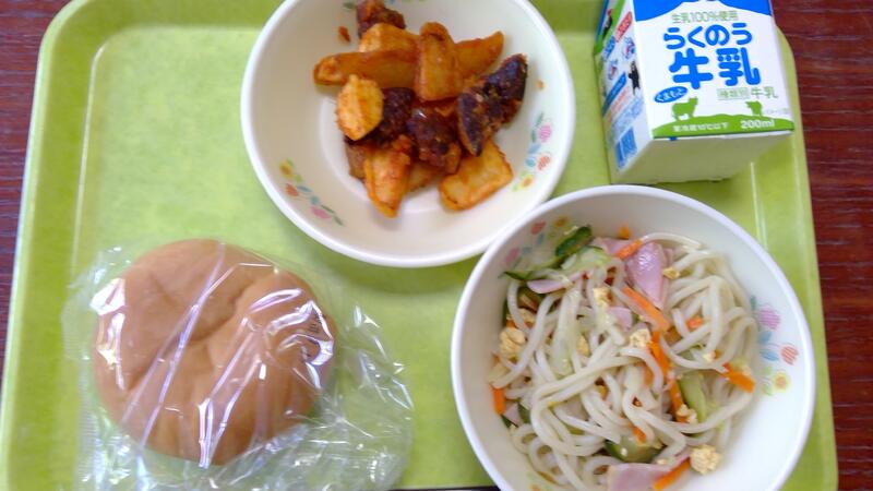 今日の献立は、丸パン、冷やし中華、ポテトとレバーのケチャップ煮でした。今日の夏バテ予防メニュー「レバー」は、独特の食感や歯ざわりが苦手な人も多いですが、かりかりになるまでしっかりと揚げ、フライドポテトと一緒にケチャップソースで和えるとおいしく食べられます。