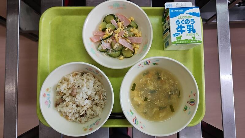 17日(水)の献立は、大豆の香味ごはん、バンサンスー、にら玉スープでした。大豆のたっぷり入った混ぜごはんはオイスターソースで中華風味でした。大豆がたっぷりのかみかみメニューになりました。
