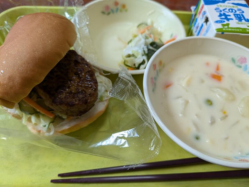 今日の献立は、ハンバーガー、コーンチャウダー、コールスローサラダでした。手作りの照焼のタレをかけたハンバーグをセルフでパンにはさんでハンバーガーを作って食べました。