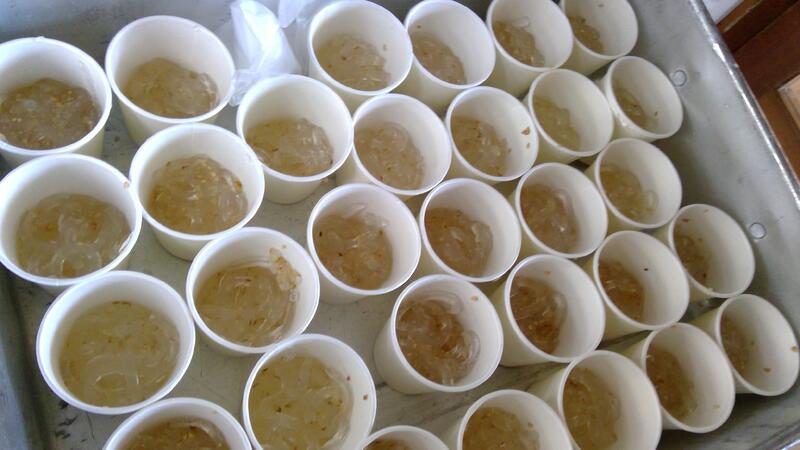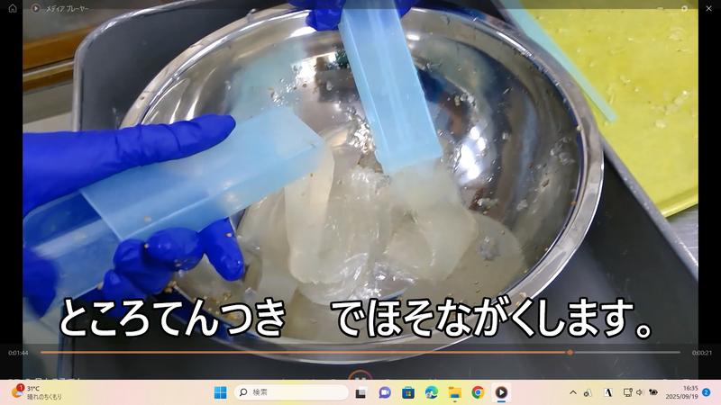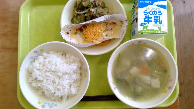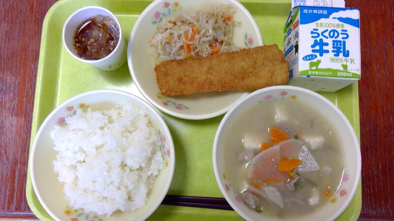 今日の献立は林田さんのごはん、太刀魚フライ、もやしのごまあえ、豚汁、ところてんでした。今月から月に一回、今泉の林田様が育てられたお米を給食に納めていただいています。つやつやと光って、甘みのある新米に子どもたちはとても喜んで味わって食べていました。今月の郷土料理「ところてん」は給食室の手作りです。てんぐさをじっくり煮溶かして冷やし固め、ところてんつきで突き出し、カップにつぎ分けました。人生初のところてんデビューの子どもたちも大勢いたようでした。