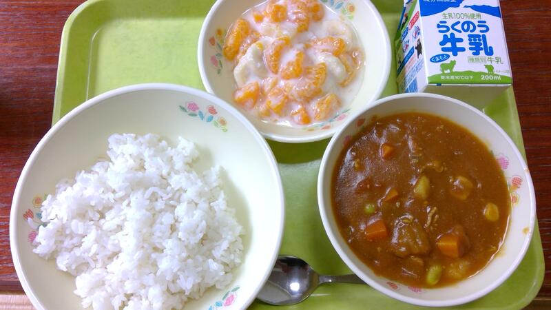 今日の献立は、スタミナカレー、フルーツヨーグルトでした。豚肉をたっぷりのにんにくと酒に漬け込みました。カレーのルーは全部で8キロ使いますが、2キロを中辛、6キロを甘口にして低学年の子どもたちでも食べやすい味にしています。