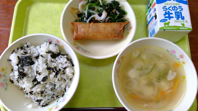 今日の献立は、のりごまごはん、春巻き、ほうれん草ナムル、ごもくスープでした。のりごまごはんは、白ごはんに白だし、ごま、塩、ごま油を混ぜて、仕上げにもみのりをトッピングして完成の簡単混ぜごはんです。お家でもぜひお試し下さい。