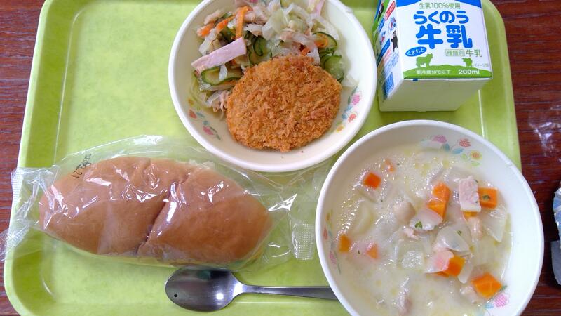 今日の献立は、コッペパン、コロッケ、ツナサラダ、白インゲンのポタージュでした。