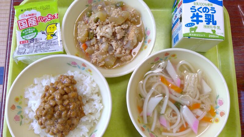 今日の献立は、麦ごはん、とうがんそぼろ煮、うどん汁、一食納豆でした。