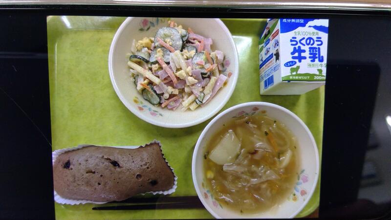 今日の献立は、チョコ蒸しパン、オニオンスープ、マカロニサラダでした。手作りのチョコ蒸しパンは、ミックス粉、に少量の砂糖とココア、マーガリン、チョコチップ、アーモンド、牛乳を混ぜてカップにつぎ分け蒸しました。「ふわふわでおいしい!」と子どもたちにも好評でした。