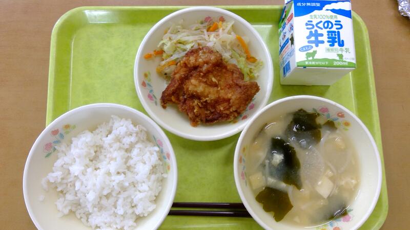 今日の献立は、麦ごはん、鶏肉の竜田揚げ、もやしのごま和え、豆腐のみそ汁でした。鶏肉竜田揚げは本来は醤油などの調味料に漬け込み、粉をまぶして揚げますが、油が汚れてしまうのをさけるために今日の給食では、肉を塩こしょう、酒に漬け込み、粉をまぶして唐揚げにした後、蒲焼き風のタレにくぐらせて味をしみこませました。子どもたちも午前中から楽しみにしてくれていた1品です。