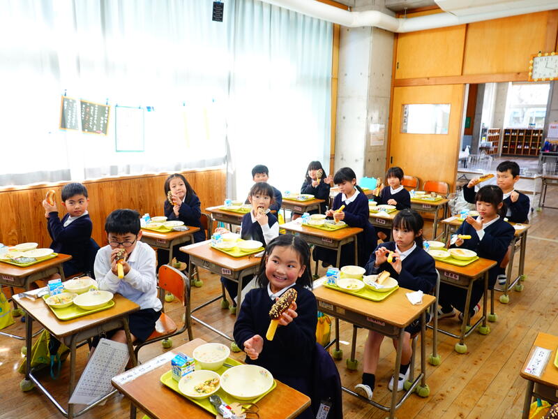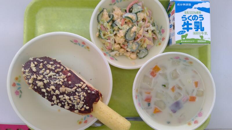 今日の献立は、金棒パン、さつまいもポタージュ、たまごサラダでした。今日は節分です。毎年恒例の金棒パンに子どもたちは大喜びでした。