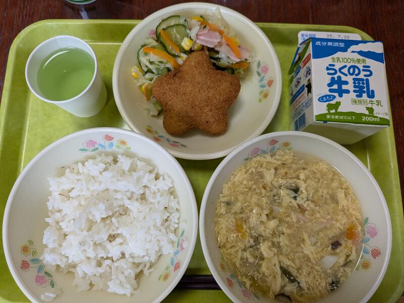 今日の献立は、星のコロッケ丼、レモンドレッシング和え、七夕ゼリーでした。行事食の星コロッケがとてもおいしかったと子どもたちに好評でした。