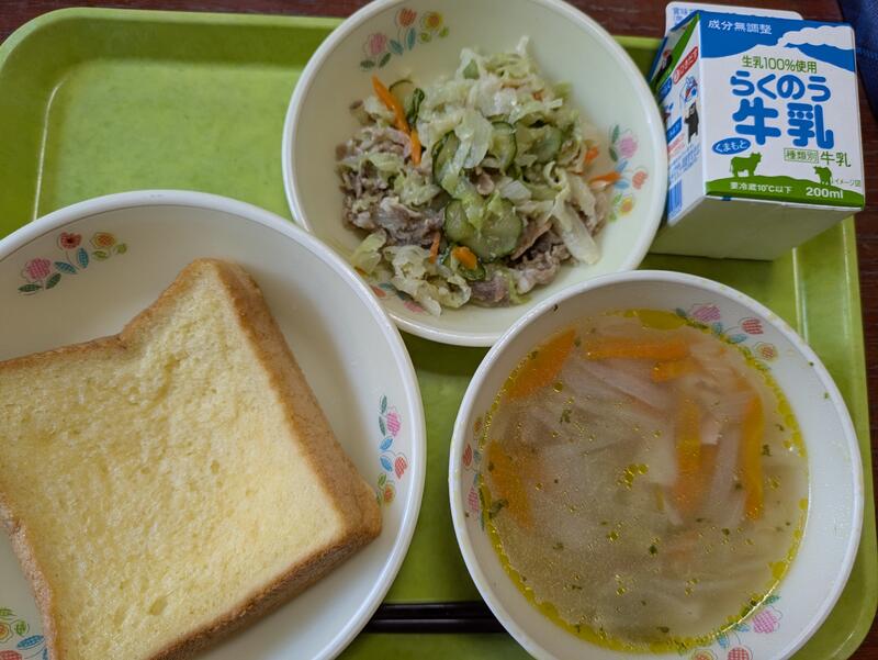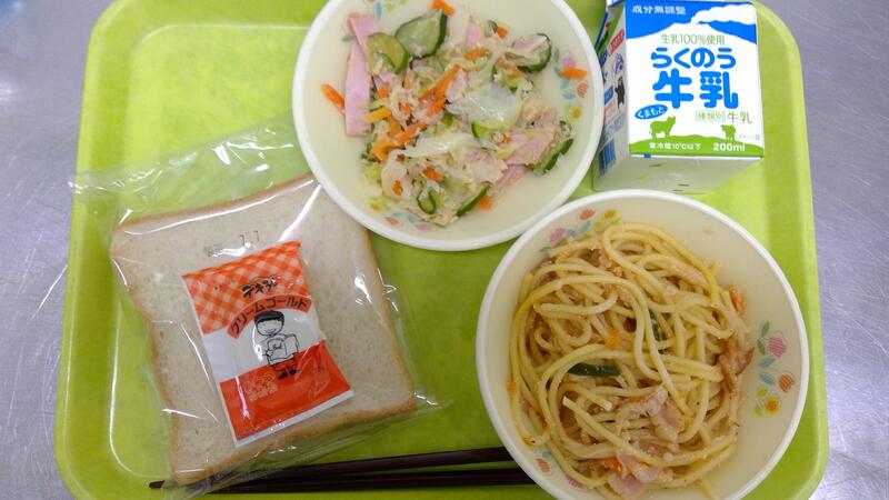 今日の献立は、食パン、クリームゴールド、たらこスパゲティ、ツナサラダでした。たらこスパゲティは和風パスタの中でも人気のメニューです。さっぱりとした手作りドレッシングのツナサラダと相性がよかったです。