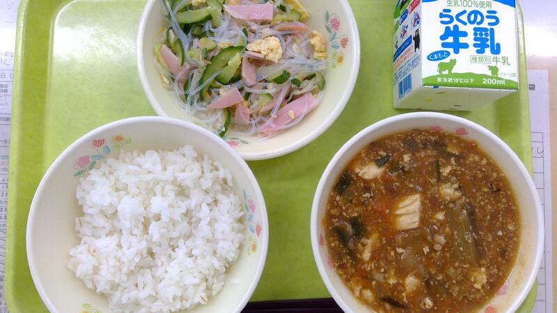 今日の献立は、麦ごはん、麻婆なす、バンサンスーでした。子どもたちの苦手な野菜の上位にランクインする夏野菜のなすです。苦手な子どもたちが多いので、小さく切ろうかと思いましたが、とけてなくなってしまうので、今日は「なすが入っている!」と分かるくらいの縦長に切りました。