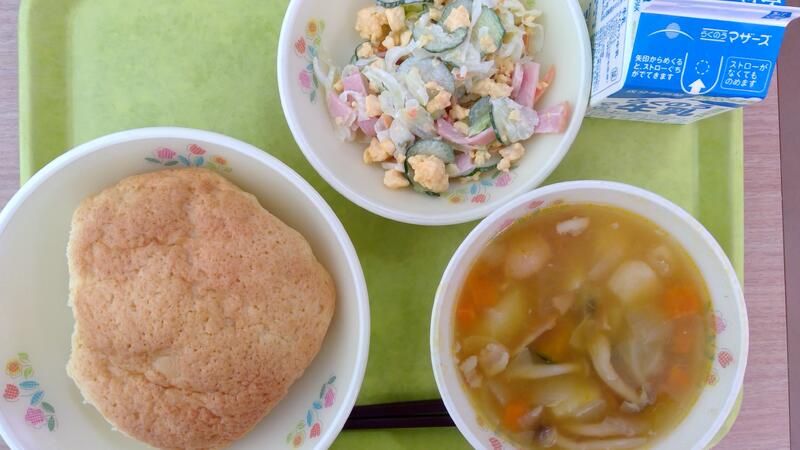 今日の献立は、手作りメロンパン、夏野菜ポトフ、卵サラダでした。学期に一度のメロンパンは子どもたちが楽しみにしているメニューの一つです。手作りのビスケット生地と冷凍パン生地を合体させ、しっかりと発酵時間を30分取り、15分焼き上げ、ふわふわサクサクのメロンパンが完成しました。