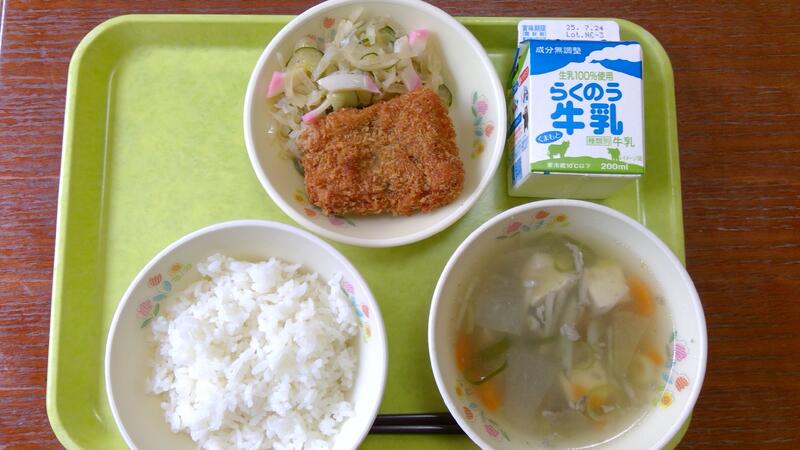 今日の献立は、ごはん、はものフライ、ゆずあえ、とうがんスープでした。上天草の特高級魚高級魚「はも」は厚みがあって食べ応えがありました。