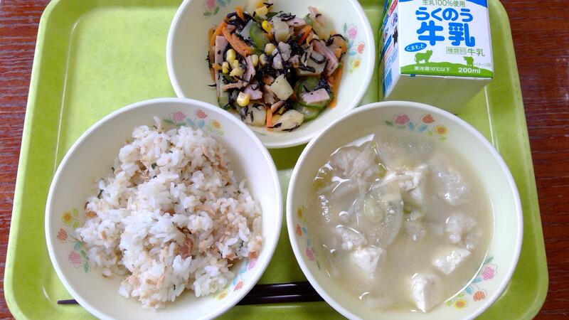今日の献立は、梅シーチキンごはん、ひじきのポテトサラダ、つみれ汁でした。つみれ汁は今月の郷土料理です。はもといわしのすり身にしぼり豆腐を加えてよくこね、一つ一つ摘み入れていきました。とてもふわふわのつみれが完成しました。ごはんは梅肉とツナ缶、ごまと細く切った大葉を混ぜるだけの、暑い夏にぴったりな簡単混ぜごはんです。