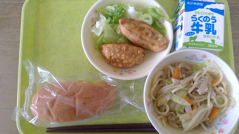今日の献立は、コッペパン、塩焼きそば、揚げぎょうざ、レタスでした。今日の焼きそばは、定番のソース味と味付けを変えてみました。塩だれと、中華スープ、塩、酒、薄口しょうゆであっさり塩味の焼きそばになりました。3年生教室ではぎょうざと焼きそばのおかわりに長蛇の列ができていました。