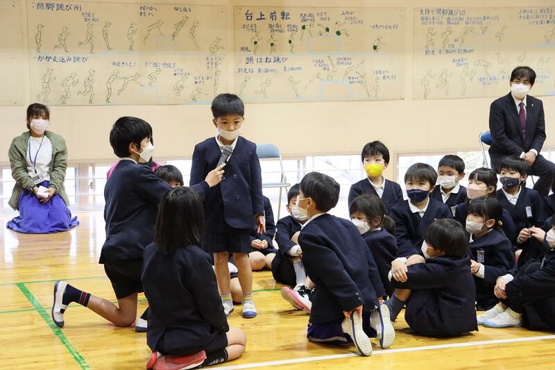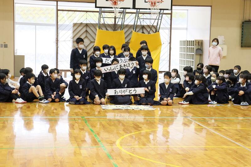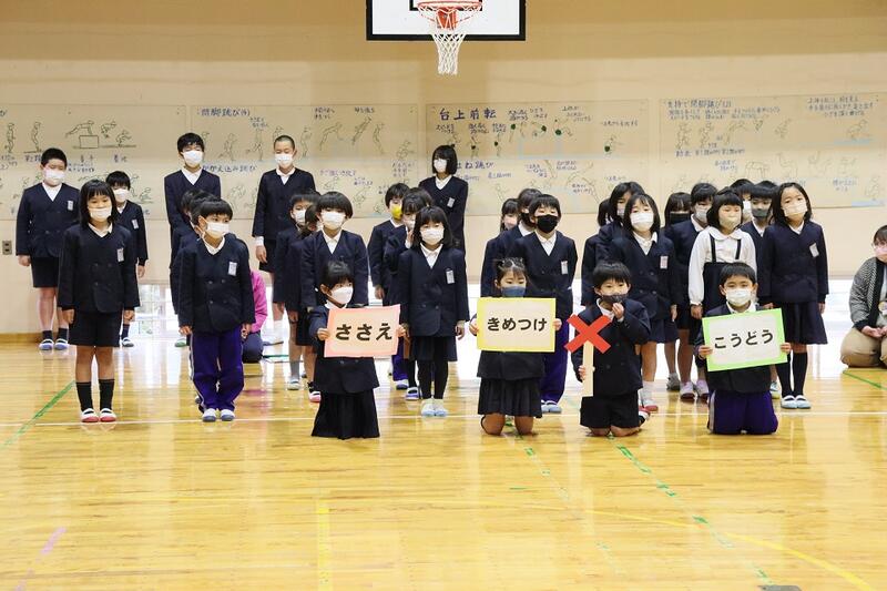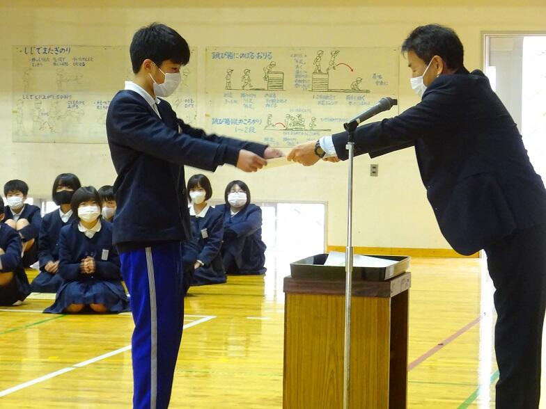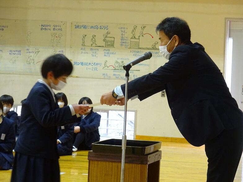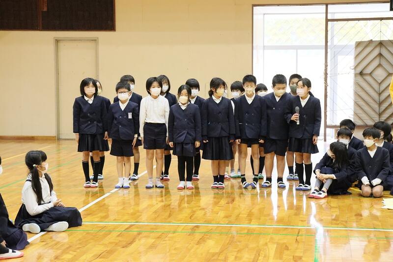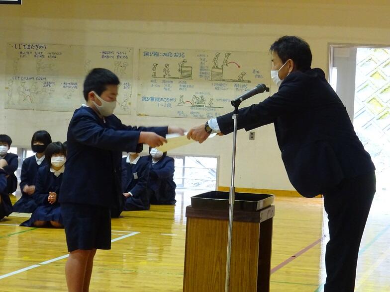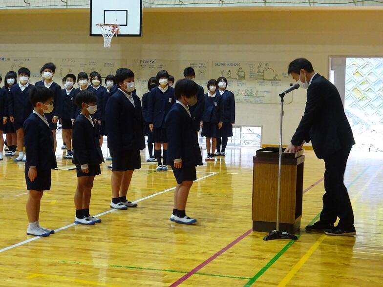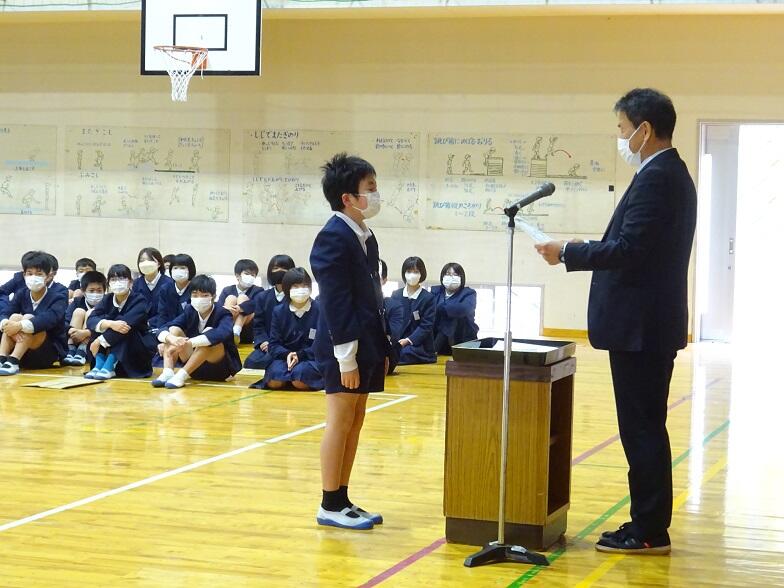 表彰では、3学期に賞状が届いた作文や絵画、俳句など文化面と、天草郡市小体連の長縄チャレンジの3位までの入賞学級を表彰しました。