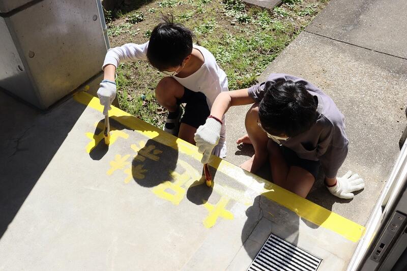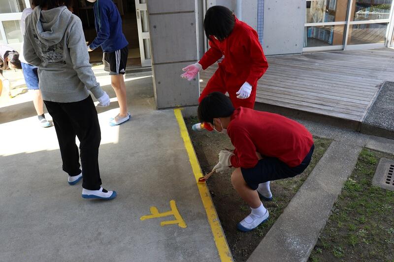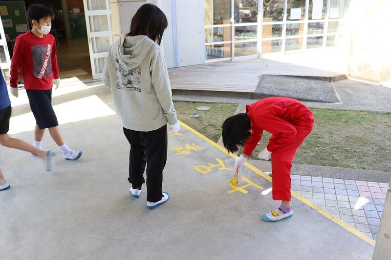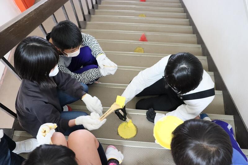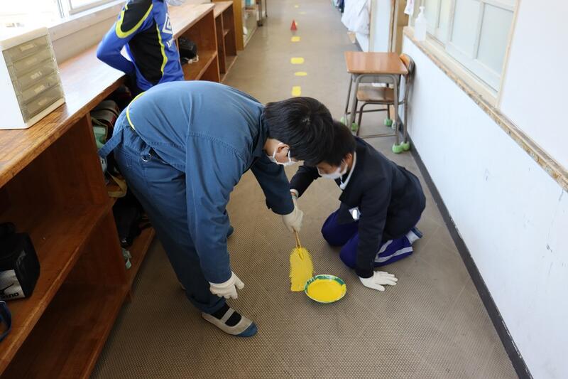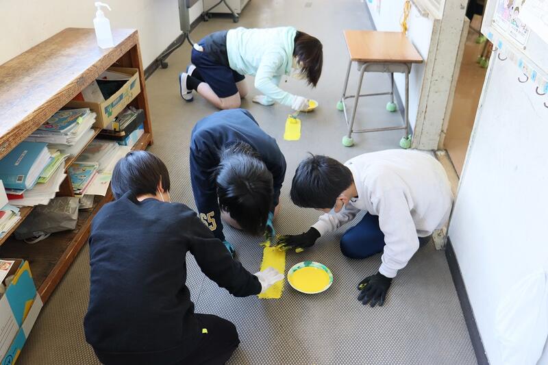 3月3日(金)③ 卒業プロジェクト 投稿日時 : 2023/03/03 学校サイト管理者 今日の5・6時間目、6年生が「卒業プロジェクト」の一環で、廊下や階段のセンターライン、土足禁止のラインや文字などを黄色のペンキで書いたり塗ったり作業をしてくれました。