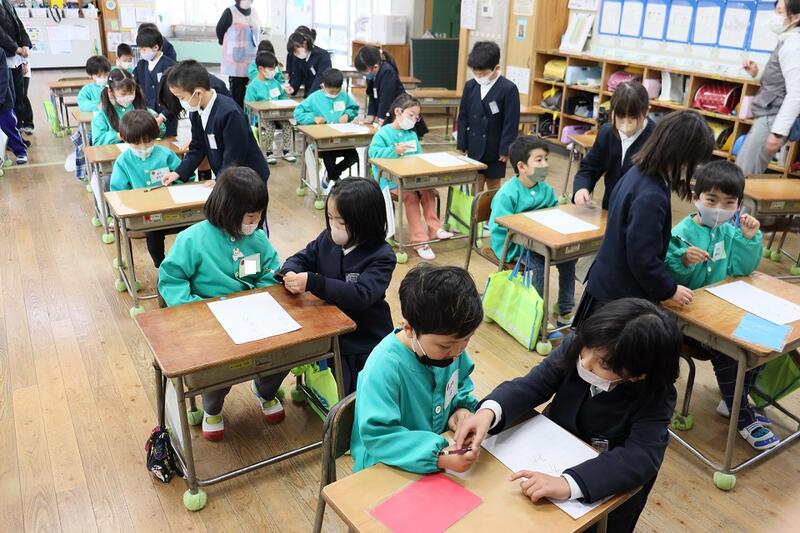 2グループに分かれ、片方は「名前書き」をしました。1年生がお手本を書いた横に、自分の名前の練習をしました。鉛筆の握り方も、1年生が教えていました。