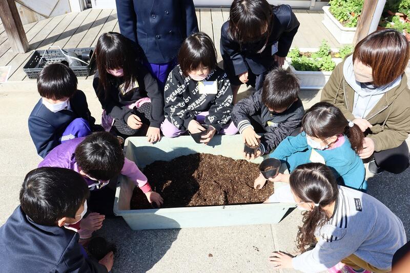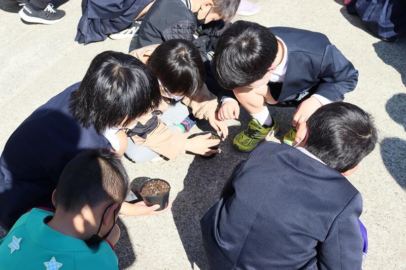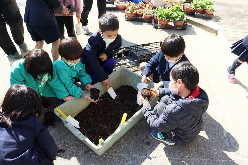 もう一方は、「種まき」をしました。ポットに土を入れ、その上にマリーゴールドの種をまきました。明日からは、1年生が水やりなどのお世話をします。
