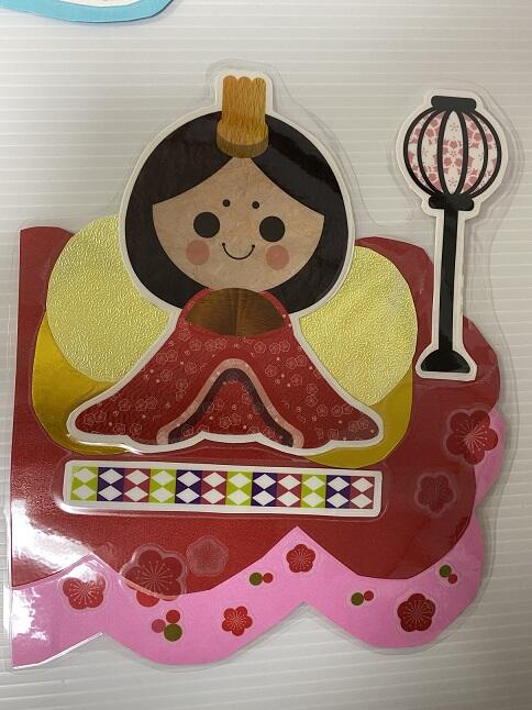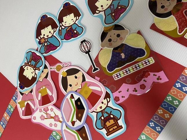 3 基本は、画用紙や色紙を使って作成していきます。今月の場合は、お雛様やお内裏様を一人ずつ画用紙で作りラミネートフィルムで加工しています。加工すると切る作業が二度手間になりますが、長持ちする上に、剝がれにくくなるというメリットがあるのでラミネート加工をするようにしています。ある程度パーツが出来上がったら、一度ボードに並べ配置を決め、パーツを増減しながら全体的なバランスを見て行きます。そして、パーツごとに養生テープで貼り付けて完成させます。