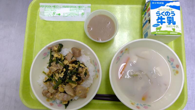 今週は6月の目玉、「万博給食週間」です。1日目は中3給食委員会考案の台湾メニューでルーロー飯、豆乳スープ、タピオカカフェオレゼリーでした。ルーロー飯は台湾の屋台で人気の丼飯です。豚肉を甘辛く炒め本来は添えてある卵と青菜ですが、給食では一緒に炒めました。デザートは台湾生まれのタピオカドリンクをイメージし、ブラックタピオカ入りのカフェオレゼリーを手作りしました。