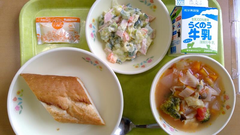 万博給食2日目は健康委員会6年生考案のフランスメニューで、フランスパン、ブイヤベース、マセドアンサラダ、マーガリンでした。ブイヤベースは魚介類がたっぷり入った南フランスの郷土料理です。今日は天草産鯛のアラでしっかりだしを取り、おいしい魚の風味が加わりました。中学生も万博給食を毎日楽しみにしてくれているようで「今日はフランスですよ!」と担任の先生に報告してくれたそうです。