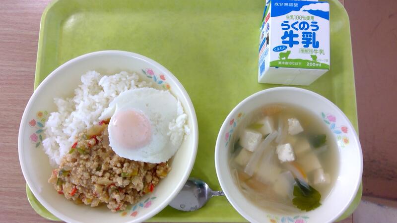 万博給食3日目、今日のタイメニューは中1の給食委員のみなさんが考案した、ガパオライス、タイ風豆腐とだいこんのスープでした。ガパオライスのひき肉炒めとスープには、タイ料理に欠かせない調味料「ナンプラー」を使いました。ナンプラーは魚からできた発酵調味料で独特の風味があるので、給食では隠し味程度の少量使用しました。子どもたちは手作りの目玉蒸しを喜んでくれました。