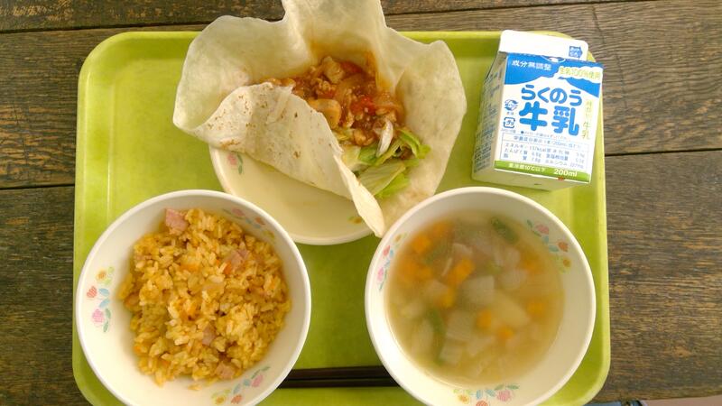 万博給食5日目、健康委員5年生考案のメキシコメニューは、メキシカンライス、タコス、ビーンズスープでした。連日初挑戦メニューが続きますが、今日のチャレンジメニューは「タコス」でした。トルティーヤに照焼トマトチキンとレタスを巻いて食べてもらいました。4年生教室ではみんな工夫してくるくる巻いたり、クレープのように包んだり、思い思いの形で楽しんで作ってくれました。メキシカンライスには普段使わないパプリカパウダーやチリパウダーを使いメキシコ風味を出しました。