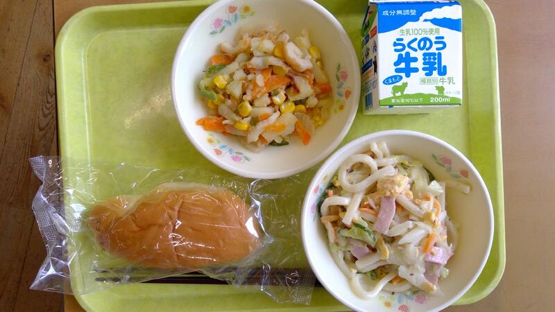 今日の献立は、ミルクパン、冷やしうどん、五色炒めでした。今日はとても暑い一日となり、冷たいおかずがぴったりでした。冷やしうどんのタレは給食室の手作りで、ごまドレ、いりごま、ねりごま、マヨネーズ、うすくち、砂糖、塩、酒、かつお節のだし汁、とたくさんの材料を混ぜ合わせて作りました。1年生教室では冷やしうどんの増量希望の子どもたちがたくさん手を挙げてくれました。なのはな教室でも「このうどん大好き!」と嬉しい声が聞かれました。