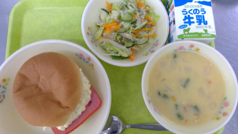 今日の献立は、ハムステーキバーガー、コーンポタージュ、レタスサラダでした。今日の力作はバーガーにはさんだ手作りのタルタルソースです。ゆで卵120個の殻をむく作業は大変でしたが、おいしく仕上がり子どもたちもパクパクと食べてくれて良かったです!